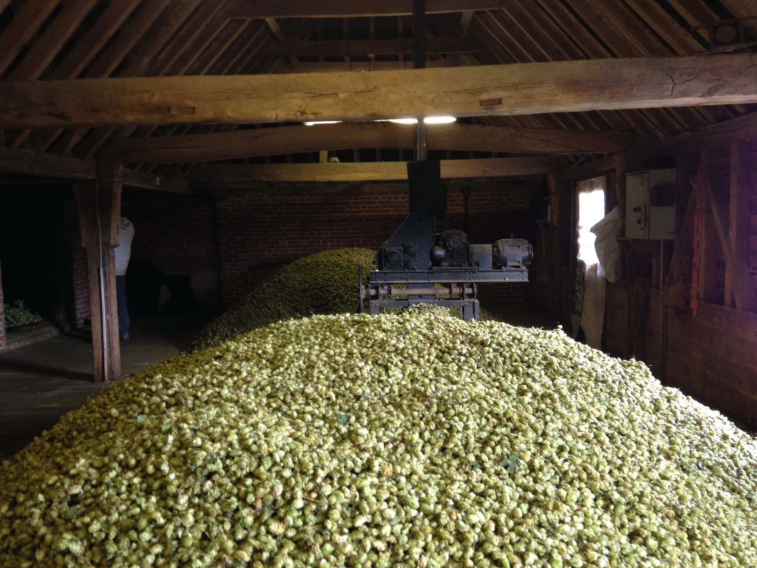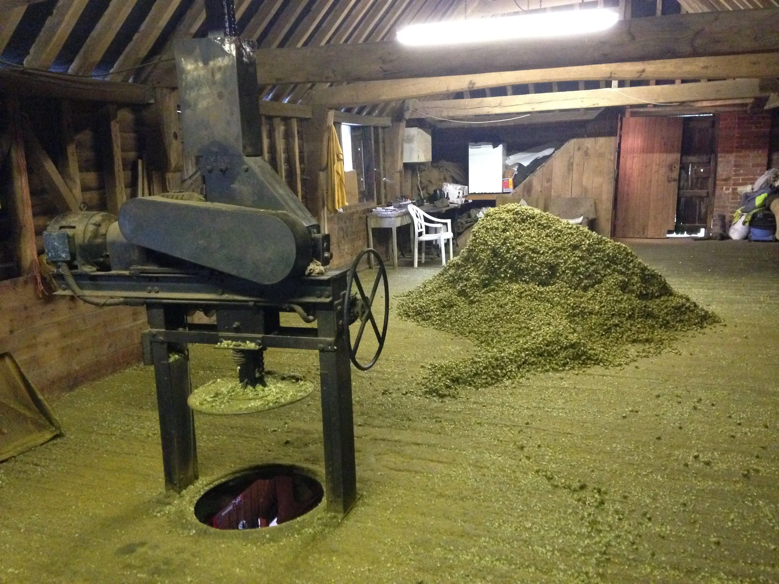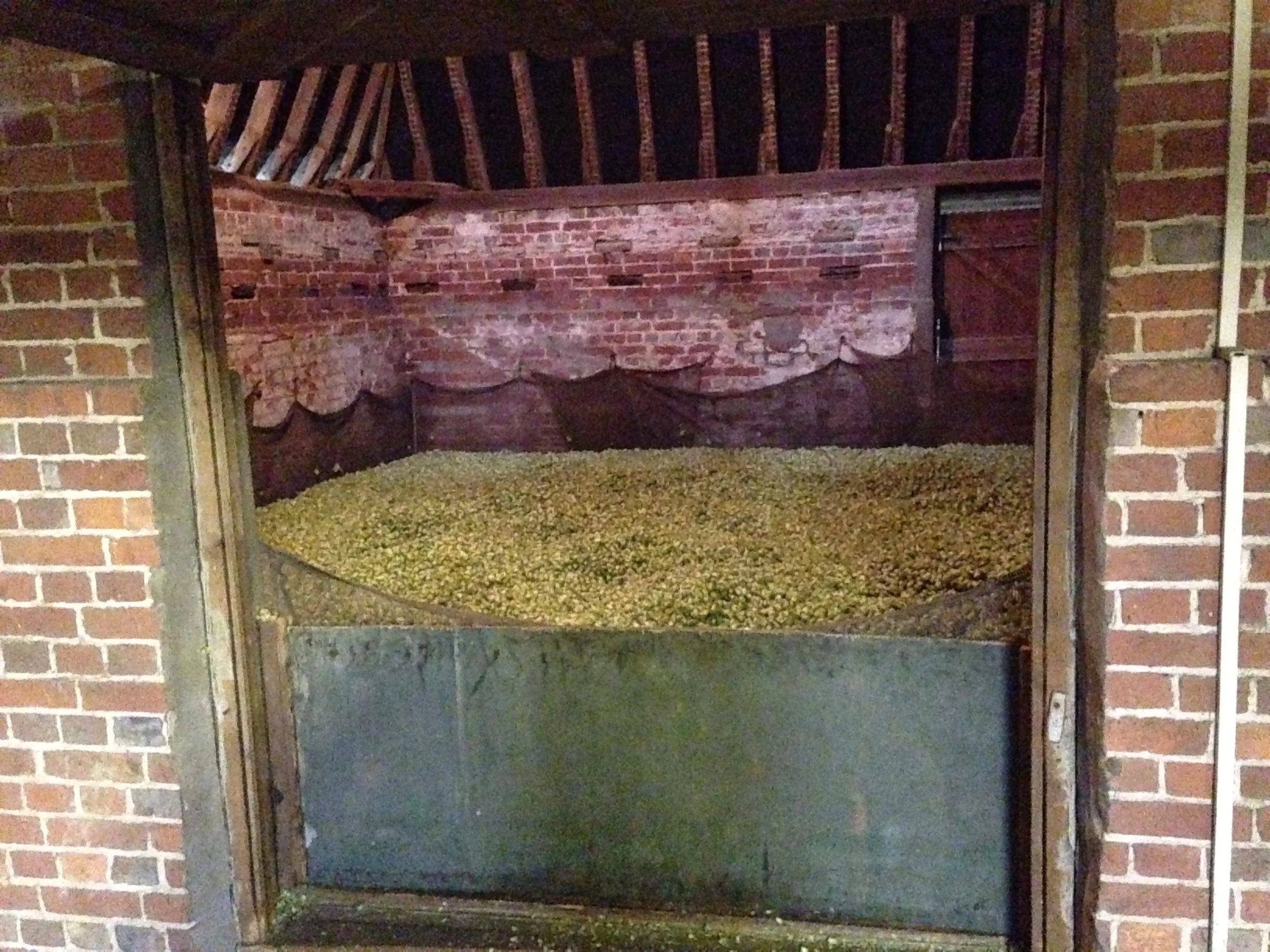 Once dried, the hops are moved into the upper floor of the barn until they have cooled. They’re then pressed into large hessian sacks, known as hop pockets. To do this, the hop pockets are suspended from a hole in the barn floor and a hop press is used to pack the pockets to the desired weight. The hop pockets are then collected from the lower floor of the barn and transported to breweries to flavour some delicious beers.