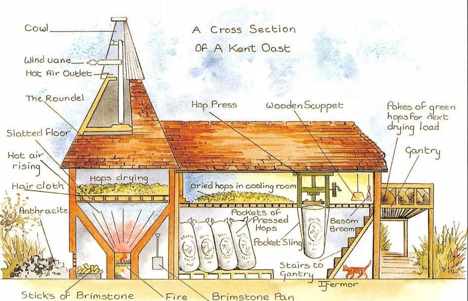 An oast consists of a brick “kiln” topped with a steeply pitched roof and a white cowl hat. Oast kilns can be round (aka a roundel) or square and are usually are connected to a stowage barn where the hops are cooled, packed and stored.